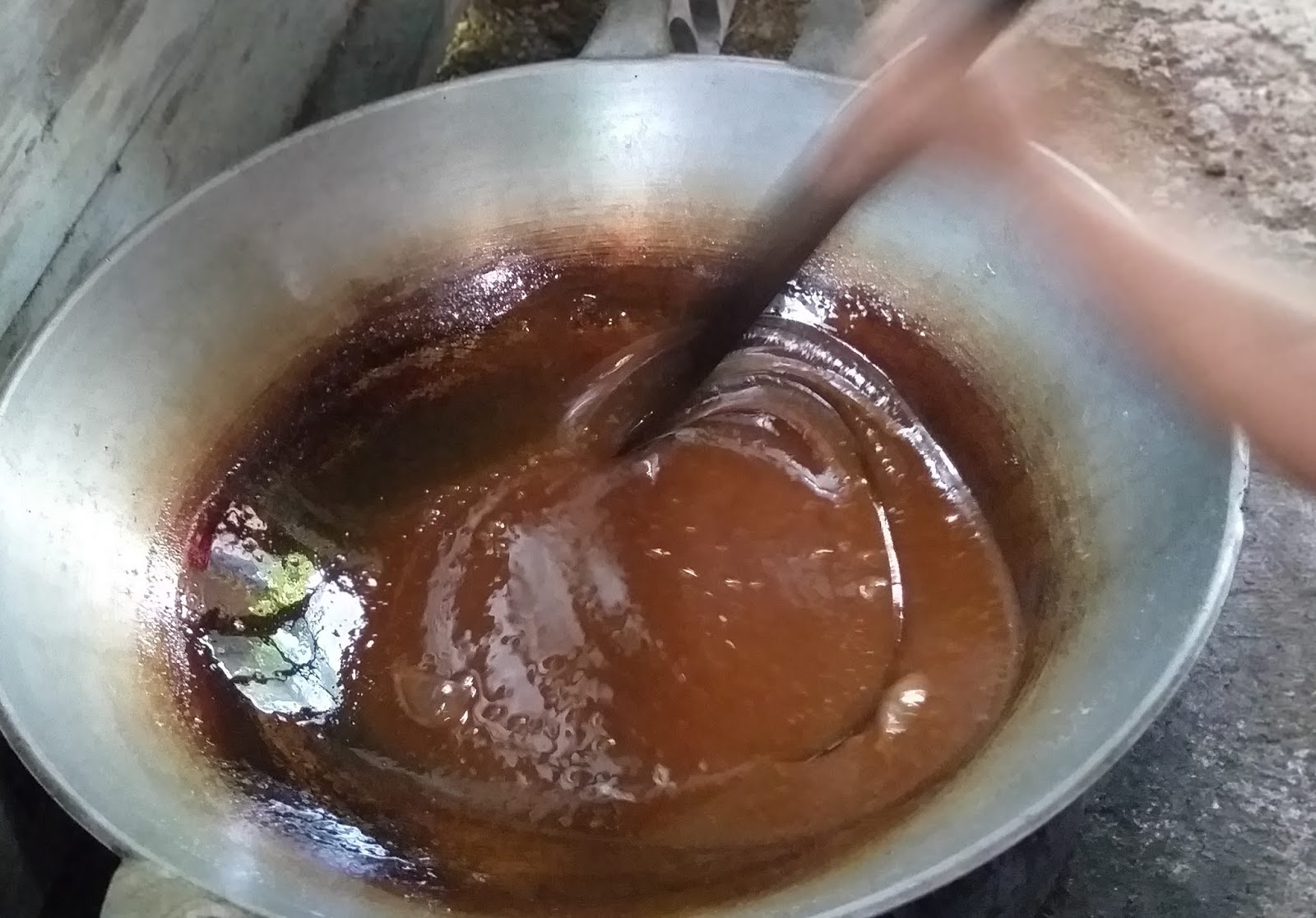5. Pengadukan dilakukan lebih sering sampai sari kental menjadi kental. Pada fase ini juga dilakukan pembersihan busa dan kotoran halus.