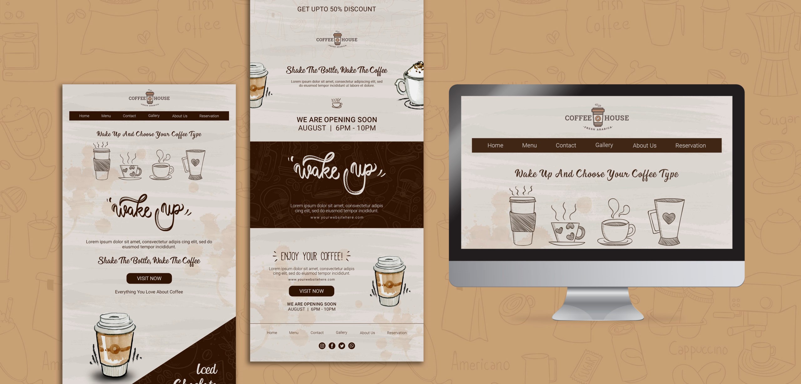 Tema warna yang digunakan harus sama dengan warna kopi. Tipografinya proporsional dengan baik dan menggabungkan font dekoratif, serif, blok, dan skrip.